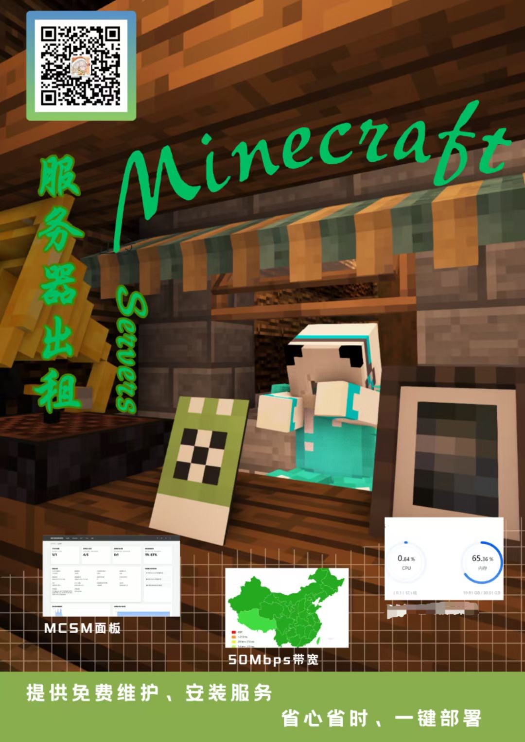 出租自建Minecraft云服务器!后台依靠MCSManager面板!操作便捷!Docker运行!安全稳定!操作系统: Ubuntu 24.0CPU: AMD Ryzen 5 7600X 6 Core12 Threads内存: 32 GB (出租10G以内)网络:中国电信50Mbps上行带宽50元/月 550元/年全程提供技术支持哦!微信加好友注明来意哦!
