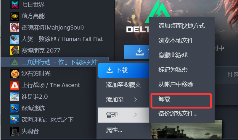 完成后不要关闭文件夹,回到Steam界面再次右键三角洲行动并点击卸载。